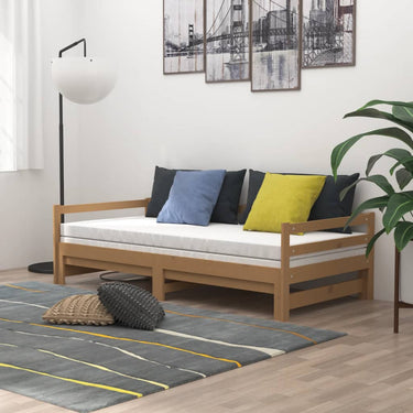 Deze houten slaapbank is ideaal voor het ontvangen van logés, terwijl hij overdag een comfortabele zitplaats biedt.
