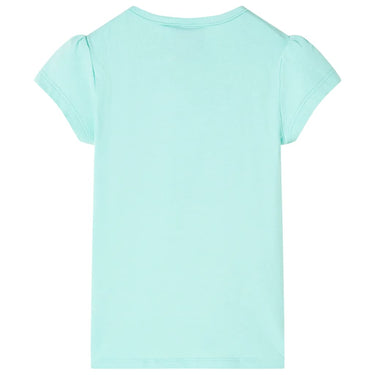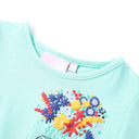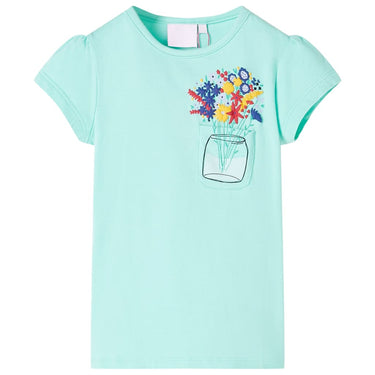Dit kindershirt heeft korte mouwen, een ronde halslijn en een recht model. Op dit lichtmintkleurige T-shirt staat een prachtige bos bloemen afgebeeld en het heeft een opgestikte zak op de linkerborst. Het kindershirt met korte mouwen is gemaakt van 95% katoen en 5% elastaan, waardoor hij comfortabel en ademend is.