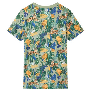 Dit kindershirt heeft korte mouwen, een ronde halslijn en een recht model. Dit kindershirt heeft een patroon van verschillende dieren en bladeren. Het T-shirt is gemaakt van 100% katoen, waardoor het zacht en comfortabel aanvoelt.