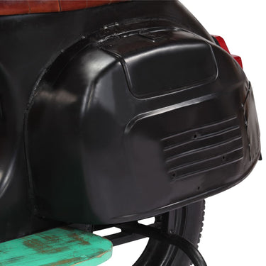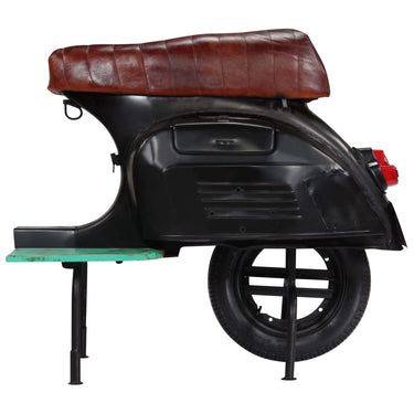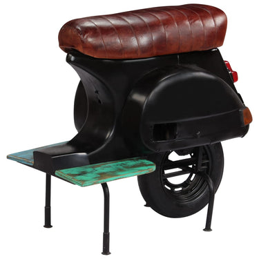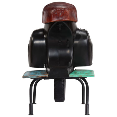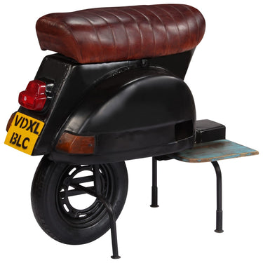 De massief gerecycled houten voetensteun en het stevig gepoedercoat stalen frame maken deze barstoel robuust en duurzaam. De zitting van deze barstoel is bekleed met echt geitenleer en heeft een schuimvulling, die vrij zacht en comfortabel is. De stoel wordt ook geleverd met een voetensteun voor het ultieme zitcomfort. De tekenen van slijtage van de scooter en de houtnerven geven de stoel een eigen geschiedenis en een unieke uitstraling. Elke stap van het bouwproces wordt uitgevoerd met de grootste zorg, of het nu gaat om het recombineren, polijsten, schilderen of lakken. Al deze kenmerken dragen bij aan de retro en vintage stijl van de stoel. Deze barstoel is eenvoudig te monteren.