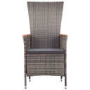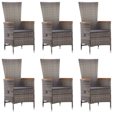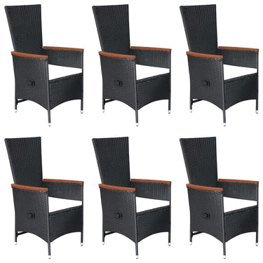 De eettafel is gemaakt van massief acaciahout, waardoor hij stevig en stabiel is. Het met olie afgewerkt oppervlak maakt de tafel geschikt voor buitengebruik. De eetstoelen hebben een stalen frame bedekt met weerbestendig PE-rattan, waardoor ze stevig en eenvoudig te reinigen zijn. De armleuningen zijn gedecoreerd met massief acaciahout voor een rustieke charme. De rugleuning kan versteld worden door aan de knop aan de zijkant te trekken. De dik gevoerde kussens bieden extra zitcomfort.