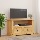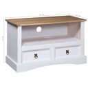 Deze stevige en robuuste tv-meubel is gemaakt van massief grenenhout. Het massieve blad biedt een stabiel en veilig oppervlak waar je je tv, een fruitmand of vaas of andere decoratieve voorwerpen op kunt plaatsen. Dit dressoir heeft 2 lades en een open vak dat voldoende ruimte biedt voor het opbergen van je multimedia-apparaten, boeken en diverse andere voorwerpen. Het heeft een gat aan de achterkant voor de kabels.
