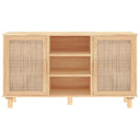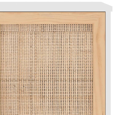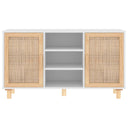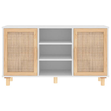 Dieses praktische Sideboard wird unterschiedlichen Anforderungen gerecht und ist eine ideale Ergänzung zu deinem Zimmer. Langlebiges Material: Holzwerkstoff ist ein Material von außergewöhnlicher Qualität mit glatter Oberfläche, das sich durch Festigkeit, Stabilität und Feuchtigkeitsbeständigkeit auszeichnet.Viel Stauraum: Mit 5 Fächern und 2 Türen versehen, bietet der Schrank reichlich Stauraum, um verschiedene Alltagssachen gut organisiert und in Reichweite aufzubewahren. Dank der Türen mit Weberei aus natürlichem Ratten ist das Sideboard auch optisch ansprechend.Beine aus massivem Kiefernholz: Die Holzbeine verleihen dem Sideboard eine natürliche und angenehme Optik und sorgen für Stabilität. Daher fügt es sich harmonisch in jede Inneneinrichtung ein.Stabile Oberplatte: Auf der Oberplatte finden deine Lieblingsfotos, Dekoartikel oder Topfpflanzen Platz, um dein Leben zu bereichern. Hinweis:Jedes Produkt wird mit einer Montageanleitung in der Verpackung für eine einfache Montage geliefert. Achtung:Um das Umkippen zu verhindern, muss dieses Produkt mit der mitgelieferten Wandhalterung gesichert werden.