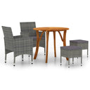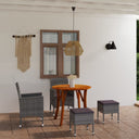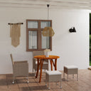 De buitentafel is gemaakt van massief acaciahout, waardoor hij stevig en stabiel is. Het met olie afgewerkte oppervlak maakt de tafel eenvoudig te reinigen met een vochtige doek. De gebogen poten dragen bij aan het stijlvolle design. De eetstoelen en krukken hebben een stalen frame bedekt met weerbestendig PE-rattan, waardoor ze stevig en eenvoudig te reinigen zijn. Elke zitting heeft een dik gevoerd kussen voor extra comfort.