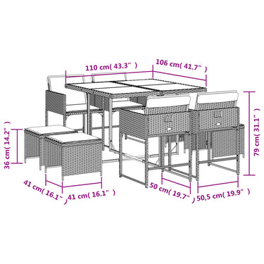 Diese Garten-Essgruppe ist eine ideale Wahl für Mahlzeiten im Freien oder einfach nur zum Entspannen im Garten, Hinterhof oder auf der Terrasse. Langlebiges Material: PE-Rattan, auch als Poly Rattan bekannt, ist ein robustes, pflegeleichtes synthetisches Material, das die Optik von natürlichem Rattan aufweist. Es kennzeichnet sich durch ein geringes Eigengewicht und lässt sich einfach reinigen. Aufgrund seiner Haltbarkeit und Witterungsbeständigkeit wird es häufig bei der Herstellung von Gartenmöbeln verwendet.Platzsparende Aufbewahrung: Dank der klappbaren Rückenlehne lassen sich die Stühle unter dem Tisch verstauen. Zudem finden auch die Hocker Platz unter den Stühlen, sodass die gesamte Essgruppe bei Nichtgebrauch eine platzsparende Würfelform bildet, um deinen verfügbaren Platz optimal auszunutzen.Bequemes Sitzerlebnis: Dieser Gartensessel mit dick gepolsterten Kissen bietet ein angenehmes Sitzgefühl.Abnehmbarer und waschbarer Bezug: Die Sitzkissen verfügen über abnehmbare Bezüge, die sich ganz einfach waschen und reinigen lassen. Dank der Klappen an der Rückseite können die Kissen ganz einfach an den Rückenlehnen befestigt werden.Tischplatte aus Glas: Die Tischplatte des Gartentisches besteht aus starkem und langlebigem Hartglas, sodass sie leicht mit einem feuchten Tuch gereinigt werden kann und deinem Außenbereich einen Hauch von Eleganz verleiht. Gut zu wissen: Wir empfehlen dir, deine Gartenmöbel mit einer wasserdichten Hülle zu schützen, um lange Zeit eine ansprechende Optik aufzuweisen.