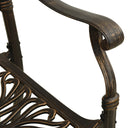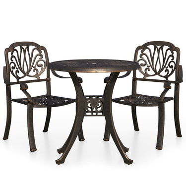 Dieses Bistro-Set aus Aluminiumguss bietet Ihnen und Ihren Gästen ein komfortables Sitzgefühl. Die Outdoor-Stühle und der Tisch aus Aluminiumguss sind robust und langlebig. Das rost- und wetterfeste Material macht das Möbelset ideal für den Außenbereich. Die schönen Muster machen das Bistro-Set zu einer eleganten Ergänzung Ihres Outdoor-Wohnbereichs. Darüber hinaus verfügt der Couchtisch über ein Schirmloch, das Ihren Sonnenschirm perfekt halten kann, um Sie vor Sonne und Regen zu schützen. HinweisUm die Lebensdauer Ihrer Gartenmöbel zu verlängern, empfehlen wir Ihnen, diese regelmäßig zu reinigen und bei Nichtgebrauch, wenn im Freien, abzudecken.Reinigung:Verwenden Sie eine milde SeifenlösungLagerung:Wenn möglich, an einem kühlen, trockenen Ort im Innenbereich lagern. Wenn das Produkt im Freien gelagert wird, schützen Sie es mit einer wasserdichten Abdeckung. Wischen und trocknen Sie das überschüssige Wasser oder den Schnee, nach Regen oder Schneefall. Sorgen Sie für eine ausreichende Luftzirkulation, um feuchtigkeitsbedingte Schäden zu vermeiden.