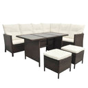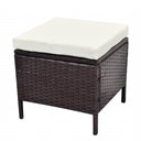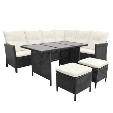 Diese Garten-Sofagarnitur vereint Stil und Funktionalität und wird ein echter Hingucker in deinem Garten bzw. auf deiner Terrasse sein. Das Set besteht aus einem robusten Stahlrahmen, der mit wetterfestem und wasserdichtem PE-Rattan bezogen ist, das pflegeleicht, strapazierfähig und für den täglichen Gebrauch geeignet ist. Die Kissen sind sehr bequem. Dank der Reißverschlüsse lassen sich die Kissenbezüge aus Polyester leicht abnehmen und waschen. Diese Gartengarnitur in Rattan-Optik lässt sich flexibel und mühelos umstellen und dadurch an jede Umgebung anpassen. Die Montage ist einfach. Die Lieferung umfasst 1 Sofa in L-Form, 1 Tisch, 2 Hocker, 7 Rückenkissen und 8 Sitzkissen. Hinweis: Wir empfehlen, das Set bei Regen, Schnee oder Frost abzudecken.
