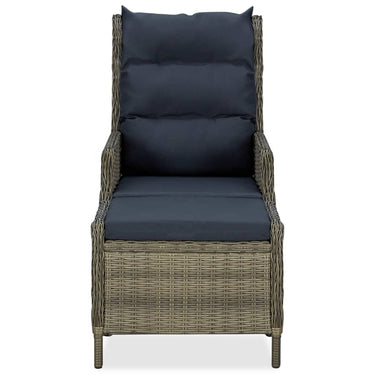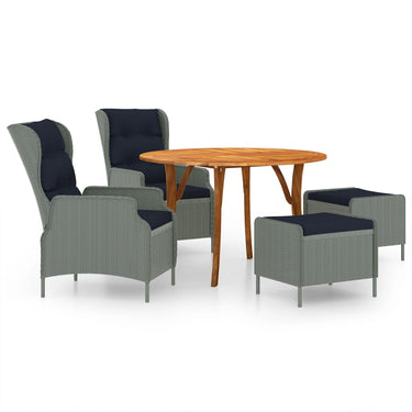 De buitentafel is gemaakt van massief acaciahout, waardoor hij stevig en stabiel is. Het met olie afgewerkt oppervlak maakt de tafel eenvoudig te reinigen met een vochtige doek. De gebogen poten dragen bij aan het trendy design. De eetstoelen en voetenbanken hebben een stalen frame bedekt met weerbestendig PE-rattan, waardoor ze stevig en eenvoudig te reinigen zijn. Elke zitting heeft dik gevoerde kussens voor extra comfort. Dankzij het gasveermechanisme is de rugleuning naar wens verstelbaar. Met de knop aan de zijkant breng je de rugleuning naar achteren, voor een comfortabele ligpositie.