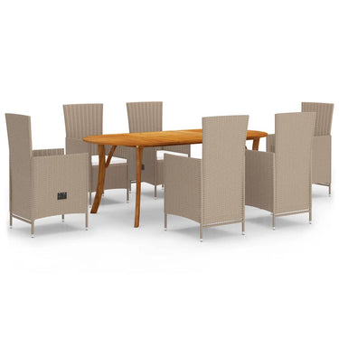 De buitentafel is gemaakt van massief acaciahout, waardoor hij stevig en stabiel is. Het met olie afgewerkt oppervlak maakt de tafel eenvoudig te reinigen met een vochtige doek. De gebogen poten dragen bij aan het trendy design. De eetstoelen hebben een stalen frame bedekt met weerbestendig PE-rattan, waardoor ze stevig en eenvoudig te reinigen zijn. De dik gevoerde kussens bieden extra comfort.