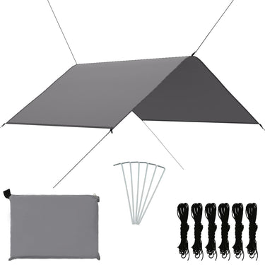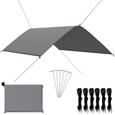 Dit tuinzeil voldoet aan al je openluchtbehoeften! Het kan gebruikt worden als rugzakzeil, regenschuilplaats, schaduwzeil voor strand/park, hangmat regenzeil, picknickmat, etc.