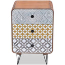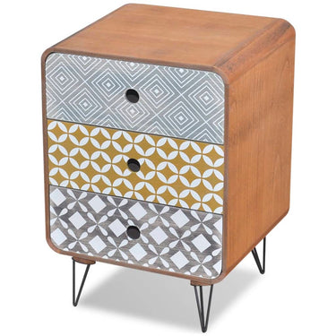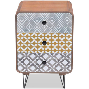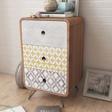 Dieser Beistellschrank mit 3 Schubladen hat ein schlichtes, aber stilvolles Design mit eleganten dekorativen Mustern in verschiedenen Farben und kann auch als Nachttisch oder Beistelltisch verwendet werden. Dieser Beistellschrank ist eine praktische und sehr dekorative Ergänzung für Ihr Schlafzimmer, Wohnzimmer oder eine Lounge. Die große Tischplatte ist ideal zum Ausstellen dekorativer Objekte wie Fotorahmen oder auch Topfpflanzen geeignet, während die drei Schubladen viel Platz für kleinere Dinge bieten, sodass diese immer in Reichweite sind. Dank des hochwertigen MDF-Materials und der starken Stahlbeine ist dieser Beistellschrank sehr robust und langlebig. Die Montage ist wirklich einfach.