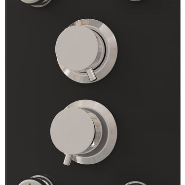 - Regenduschkopf, Massagedüsen, Handduschkopf und Drehknöpfe sind verchromt