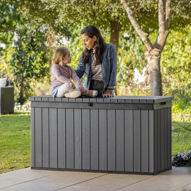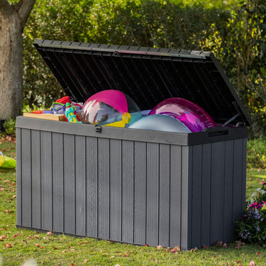 Diese strapazierfähige Darwin Garten-Aufbewahrungsbox von Keter bietet mit ihrem Fassungsvermögen von 380 L reichlich Stauraum, um verschiedenes Gartenzubehör ordentlich aufzubewahren. Mit ihrer Holzoptik und ihrem rustikalen Stil ist diese Gartenbox eine tolle Ergänzung für deinen Outdoor-Wohnbereich. Die Darwin Kissenbox hat ein Fassungsvermögen von 380 Litern, perfekt auch für Loungemöbel-Kissen und Gartenmöbel-Auflagen aber auch für Poolzubehör. Der Deckel ist mit praktischen Gasdruckfedern ausgestattet, die ein einfaches und sicheres Öffnen und Schließen ermöglichen. Dank der wetterfesten Konstruktion hält die Box Sonne und Regen stand und sorgt dafür, dass dein Hab und Gut trocken und belüftet bleibt. Außerdem ist die Gartenbox abschließbar (Vorhängeschloss nicht im Lieferumfang enthalten). Die Aufbewahrungsbox Darwin ist aus hochwertigem Evotech gefertigt, einem fortschrittlichen Verbundwerkstoff von Keter, das eine natürliche Holzoptik aufweist und selbst ohne Pflege unglaubliche Haltbarkeit bietet. Sieht aus wie Holz, ist aber besser!
