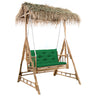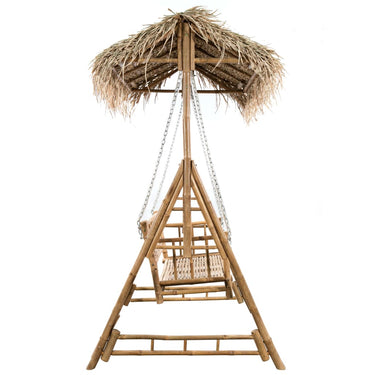 De schommelbank is vervaardigd van weerbestendig en duurzaam bamboe. Hij heeft een overkapping die bedekt is met palmbladeren en geeft je buitenruimte een tropisch tintje. De schommelbank wordt opgehangen met metalen kettingen om optimale veiligheid te garanderen. Bovendien zorgen de meegeleverde kussens voor extra comfort tijdens het loungen. Elk kussen heeft twee sets touwtjes voor stevige bevestiging aan de bank.