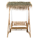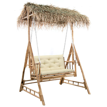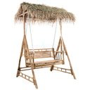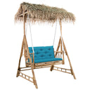 De schommelbank is vervaardigd van weerbestendig en duurzaam bamboe. Hij heeft een overkapping die bedekt is met palmbladeren en geeft je buitenruimte een tropisch tintje. De schommelbank wordt opgehangen met metalen kettingen om optimale veiligheid te garanderen. Bovendien zorgen de meegeleverde kussens voor extra comfort tijdens het loungen. Elk kussen heeft twee sets touwtjes voor stevige bevestiging aan de bank.