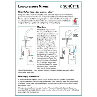 - Niederdruck: Nur für drucklose Untertischgeräte/Kleinspeicher geeignet