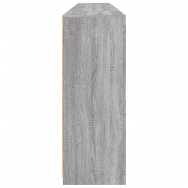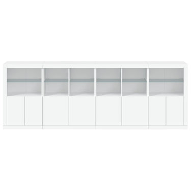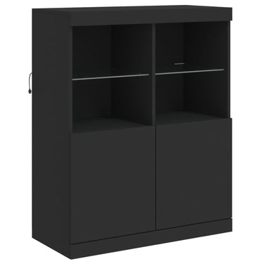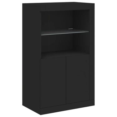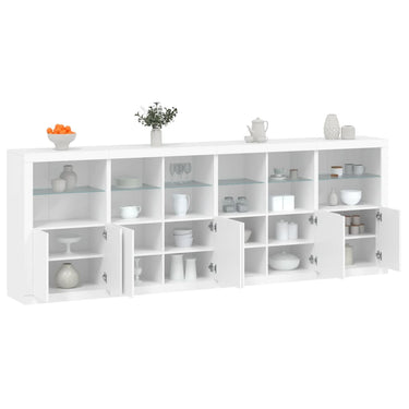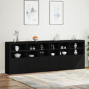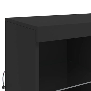 Dekoriere dein Zuhause mit diesem modernen Sideboard mit LED-Beleuchtung, das sich leicht mit Möbeln in jedem Stil kombinieren lässt. Langlebiges Material: Der Holzwerkstoff ist von außergewöhnlicher Qualität mit glatter Oberfläche und zeichnet sich außerdem durch Festigkeit, Stabilität und Widerstandsfähigkeit gegen Feuchtigkeit aus.RGB-LED-Lichter: Das Buffet ist mit leuchtenden RGB-LED-Leuchten ausgestattet. Mit verschiedenen anpassbaren Menüs kannst du die Farbe der Lichter mühelos ändern und sie sogar so einstellen, dass sie sich automatisch anpassen. Diese LED-Leuchten unterstreichen nicht nur den modernen Look des Sideboards, sondern tragen auch zu seiner trendigen Ausstrahlung bei.Ausreichend Stauraum: Der Aufbewahrungsschrank bietet viel Platz, um deine alltäglichen Dinge übersichtlich und leicht zugänglich aufzubewahren.Präsentationsfunktion: Die robuste Oberseite des Flurschranks eignet sich ideal zum Ausstellen von Dekorationsgegenständen, Bilderrahmen oder Topfpflanzen.Praktische Türen: Verstecke deine Utensilien hinter den Türen des Seitenschranks, um sie vor Staub zu schützen. Gut zu wissen:Das Produkt verfügt über einen USB-Anschluss, für den eine zertifizierte 5V-USB-Stromquelle erforderlich ist (nicht im Lieferumfang enthalten). Achtung:Um ein Umkippen zu vermeiden, sollte dieses Produkt mit der mitgelieferten Wandhalterung gesichert werden.