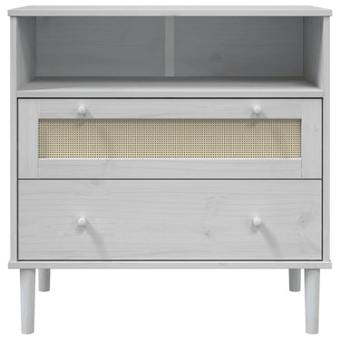 Mit seinem minimalistischen Design wird dieses Sideboard aus Holz deinen unterschiedlichen Bedürfnissen gerecht und verleiht deinem Zimmer einen einzigartigen Look. Massives Kiefernholz: Massives Kiefernholz ist ein wunderschönes Naturmaterial. Kiefernholz weist eine gerade Maserung auf und die Aststellen verleihen dem Material seine charakteristische, rustikale Optik.UV-Lackierung: UV-Lackierung ist eine spezielle Art von Lackierung, die mittels einer UV-Trocknungsanlage aufgetragen wird. Im Vergleich zu anderen Lackierungen sorgt sie für eine lebendigere, luxuriösere und taktilere Oberflächenbearbeitung.Viel Stauraum: Dieser Beistellschrank verfügt über 2 Schubladen und 1 Fach und bietet reichlich Stauraum, um deine Zeitschriften, Bücher, DVDs, Multimediageräte und andere wichtige Sachen gut organisiert und griffbereit aufzubewahren.Rattan-Optik: Die Front der oberen Schublade ist aus Poly Rattan handgefertigt, wodurch Mid-Century Modernismus mit Boho-Stil kombiniert werden, um deinem Interieur eine einladende und dennoch stilvolle Note zu verleihen.Stabile Oberplatte: Die stabile Oberseite eignet sich perfekt zum Aufstellen von Topfpflanzen, Fotorahmen und anderen Dekorationsgegenständen. Achtung:Um ein Umkippen zu vermeiden, sollte dieses Produkt mit der mitgelieferten Wandhalterung gesichert werden.