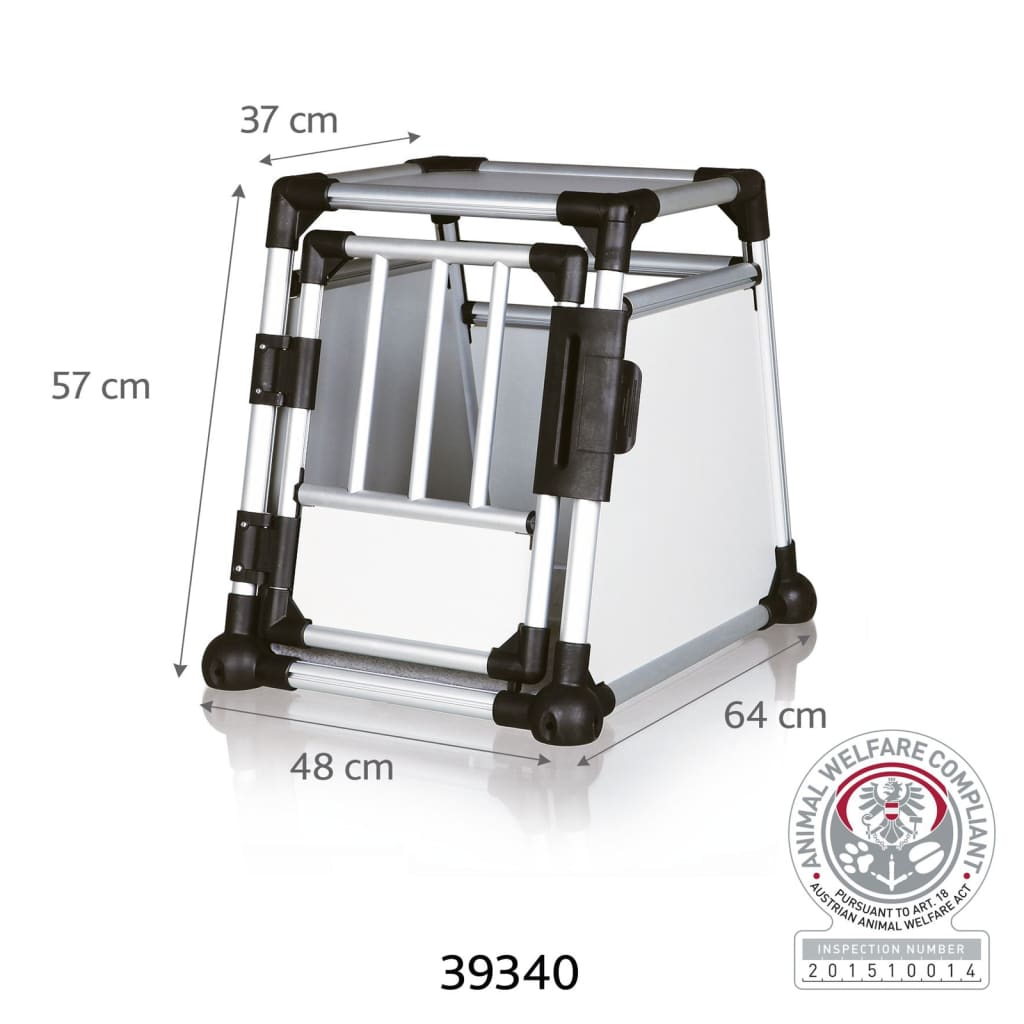 Diese Aluminium-Tiertransportbox L TRIXIE mit Aluminiumrahmen ist eine robuste Hundebox und eignet sich perfekt, um Ihr Haustier bequem und sicher zu transportieren. Dank des schrägen Designs der Vorder- und Rückseite können Sie ihn im Kofferraum platzieren, ohne dass er zu viel Platz einnimmt. Außerdem bieten die Klettverschlüsse am Boden einen guten Halt im Kofferraum und transportieren Ihr Tier ohne das Risiko plötzlicher Bewegungen. Damit eignet sich die Haustierkiste perfekt für den Transport eines kranken Tieres zum Tierarzt. Die hohen, geschlossenen Wände sorgen dafür, dass Ihr Kofferraum sauber bleibt und sind ideal, um Auslöser und Lärm von außen zu verringern. Mit der stabilen Tür und einem Sicherheitsschloss bleibt Ihr Haustier sicher und geschützt. Eine rutschfeste Liegematte sorgt dafür, dass es Ihr pelziger Freund während der Reise bequem hat. Die Matte ist außerdem bei bis zu 30°C in der Maschine waschbar.
