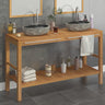 Dieser Badezimmerschrank mit 2 Flusssteinbecken sieht mit seinem schlichten und einfachen Stil wunderschön aus und passt so perfekt zu Ihrer Badeinrichtung. Der Waschbeckenschrank besteht aus massivem Teakholz, das robust genug ist, um zwei Waschbecken sowie anderes Badzubehör zu halten. Das Badmöbel verfügt über 2 Haltestangen zum Aufhängen von Handtüchern oder Kleidungsstücken. Die vier Stützbeine sorgen zudem für Stabilität und Trockenheit über dem Boden. Der Schrank passt perfekt unter Ihr Waschbecken und macht die Aufbewahrung im Badezimmer sehr bequem. Das Produkt weist ein schönes Finish auf, das dem Holz eine warme Farbe verleiht. Dieser Schrank muss zusammengebaut werden.