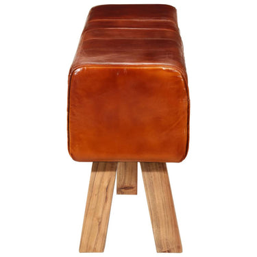 Schaffe eine Vintage-Atmosphäre in deinem Wohnraum mit dieser Bock-Sitzbank aus Echtleder. Diese Bank ist mit strapazierfähigem Echtleder bezogen und bietet ein hervorragendes Sitzgefühl. Die Sitzbank im Turnbock-Design ist mit Beinen aus massivem Mangoholz versehen, die für Stabilität und Robustheit sorgen. Zudem bietet die dicke Polsterung zusätzlichen Komfort.