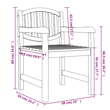 Genieße eine angenehme Mahlzeit oder einen Nachmittagstee in deinem Außenbereich an dieser Essgruppe aus Holz! Massives Teakholz: Massives Teakholz ist ein wunderschönes Naturmaterial. Es wurde abgelagert, getrocknet und anschließend fein geschliffen, um eine sehr glatte Optik und Haptik zu erhalten. Teakholz ist für seine außergewöhnliche Festigkeit und Witterungsbeständigkeit bekannt.Praktische Tischplatte: Die robuste Tischplatte bietet Platz für Snacks, Obstkörbe, Dekoartikel und andere Sachen.Bequemes Sitzerlebnis: Dank der Rückenlehne und der Armlehnen bietet der Gartenstuhl höchsten Sitzkomfort.Einfach Reinigung: Durch die glatte Oberfläche lässt sich das Gartenmöbel-Set leicht mit einem feuchten Tuch reinigen. Gut zu wissen:Damit deine Gartenmöbel lange schön bleiben, empfehlen wir dir, sie mit einer wasserdichten Hülle zu schützen.