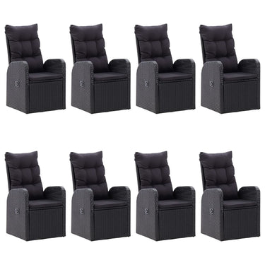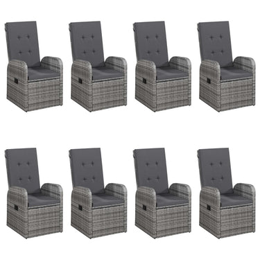 Schaffen Sie mit dieser Garten-Essgruppe eine überzeugende und zusammenhängende Ästhetik in Ihrem Außenbereich! Der Esstisch besteht aus massivem Akazienholz mit Ölfinish, was ihn stabil, langlebig und pflegeleicht macht. Die Esszimmerstühle verfügen über pulverbeschichtete Stahlrahmen, die mit witterungsbeständigem PE-Rattan überzogen sind, und sind daher robust und leicht zu reinigen. Die Rückenlehne lässt sich durch Ziehen am seitlichen Knopf verstellen. Dank ihrer Leichtbauweise lassen sich die Stühle auch einfach umstellen. Sie werden zudem mit äußerst komfortablen, dick gepolsterten Auflagen geliefert, die für höchsten Komfort sorgen. Deren pflegeleichte Bezüge aus Polyester können leicht abgenommen und gewaschen werden. Wichtiger Hinweis: Wir empfehlen, die Essgruppe bei Regen, Schnee und Frost für eine lange Lebensdauer abzudecken.