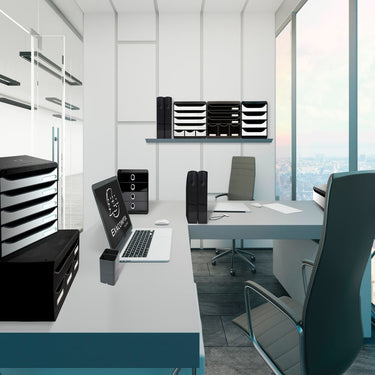 - Ladeblok voor op een bureau met 7 lades van 43 mm (4 lades voor het opbergen van documenten in A4-formaat en 3 smalle lades voor het opbergen van kantoorbenodigdheden)