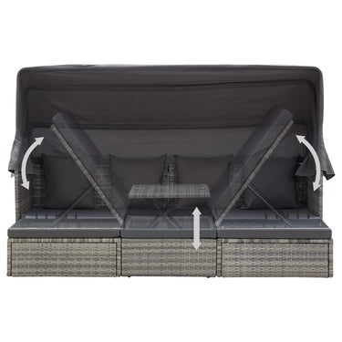 Dieses Tagesbett bietet einen idealen Rückzugsort zum Entspannen und Genießen deiner Freizeit am Swimmingpool, in deinem Garten, auf deiner Terrasse usw. Mit dieser eleganten Sonnenliege kannst du sowohl deinen Außenbereich aufwerten als auch deine Freizeit auf stilvolle Weise genießen. Die Liege ist aus PE-Rattan gefertigt, das wasserfest, UV-beständig und pflegeleicht ist. Der Tisch lässt sich je nach Bedarf aufklappen. Dank des pulverbeschichteten Stahlrahmens ist die Sonneninsel stabil und langlebig. Die dicken Kissen und Auflagen fühlen sich weich an und bietet höchsten Komfort. Die abnehmbaren und waschbaren Bezüge sind mit Reißverschlüssen versehen. Das Dach schützt dich vor der Sonne, wenn du an sonnigen Tagen liest oder dich entspannst. Unsere Sonnenliege lässt sich einfach zusammenbauen. Hinweis: Wir empfehlen, die Sonnenliege bei schlechtem Wetter wie Regen, Schnee oder Frost abzudecken.