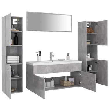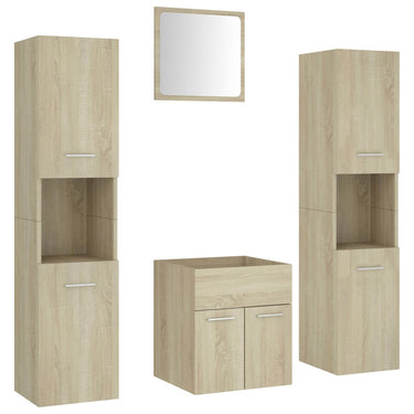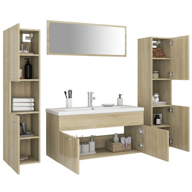 De meubelset bestaat uit een wastafelkast, twee hoge kasten en een spiegel. De chique wastafelkast heeft 1 vak en het bovenblad daarvan is ideaal voor het plaatsen van de wastafel. Elke hoge kast heeft in totaal 5 vakken en 2 deuren, waardoor er voldoende ruimte is om spullen in je badkamer op te bergen. De spiegel geeft je interieur een prachtige uitstraling. Deze badkamerset is gemakkelijk schoon te maken met een vochtige doek.