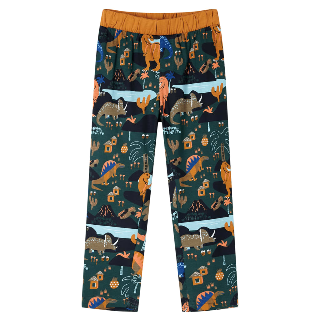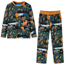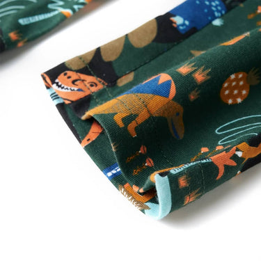 Deze kinderpyjama met lange mouwen heeft een geribbelde ronde halslijn, een elastische tailleband en een normale pasvorm. Op de kinderpyjama's staan dinosaurussen, heuvels, planten en huisjes. Deze kinderpyjama is gemaakt van 100% katoen, waardoor hij comfortabel en ademend is.