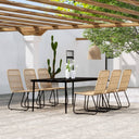 Het stalen frame maakt de tafel en stoelen stevig en stabiel. Omdat de set ook lichtgewicht is, zijn alle onderdelen gemakkelijk te verplaatsen. Het gladde, glazen tafelblad is gemakkelijk schoon te maken met een vochtige doek en is perfect voor het plaatsen van maaltijden, drankjes of decoratieve items. De tuinstoelen zijn gemaakt van PE-rattan, waardoor ze bestand zijn tegen slecht weer en uv-stralen. De gebogen rugleuningen dragen bij aan het zitcomfort.