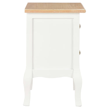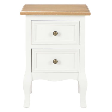 Elk kastje heeft 2 lades. Het transparant gelakte hout maakt de nachtkastjes nog eleganter. Ook hebben ze taps toelopende poten en geborsteld nikkelen knoppen. De tafels zijn afgewerkt met duurzaam wit MDF.