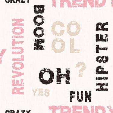 Dit roze en zwarte behang met woorden en letters maakt deel uit van de Noordwand Friends & Coffee Words and Letters collectie, die bestaat uit een breed scala aan achtergronden met grafische prints van industriële tot moderne stijlen en in verschillende kleuren.