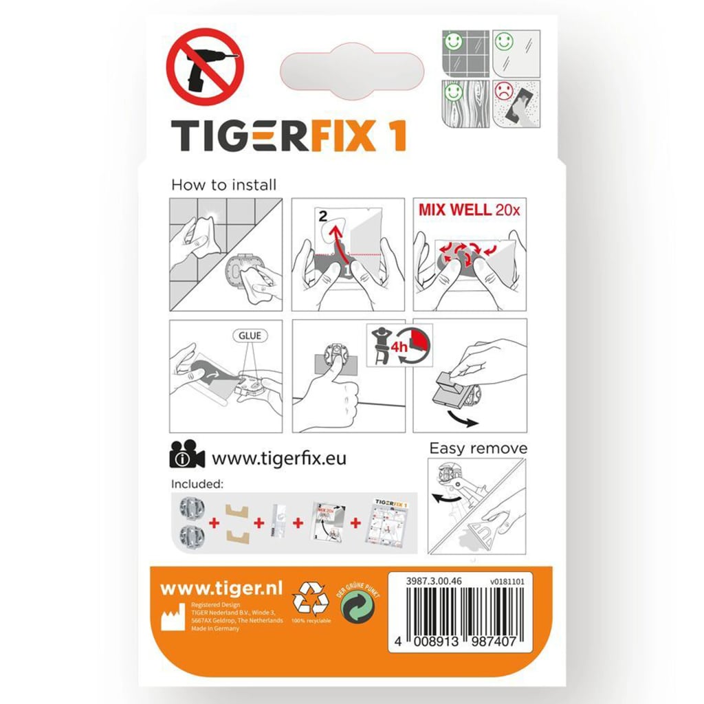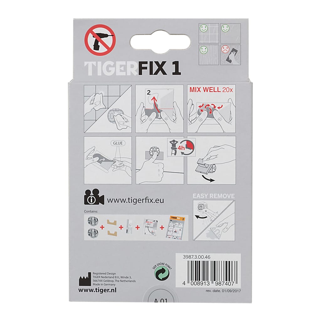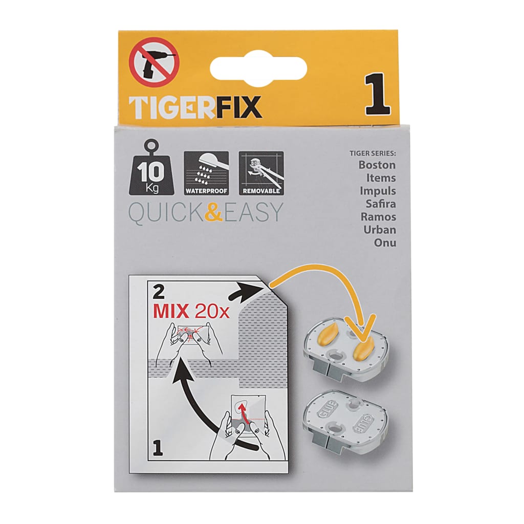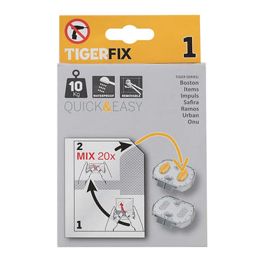 Wilt u geen gaten in uw nieuwe badkamertegels boren, met name in natuursteen of grote tegels? Dan is TigerFix de oplossing. De innovatieve TigerFix Type 1 maakt gebruik van een gepatenteerd lijmsysteem, waardoor Tiger badkameraccessoires eenvoudig op elk glad, hard oppervlak kunnen worden gemonteerd zonder te hoeven boren of het montageoppervlak te beschadigen. De accessoires kunnen ook weer verwijderd worden zonder resten achter te laten.