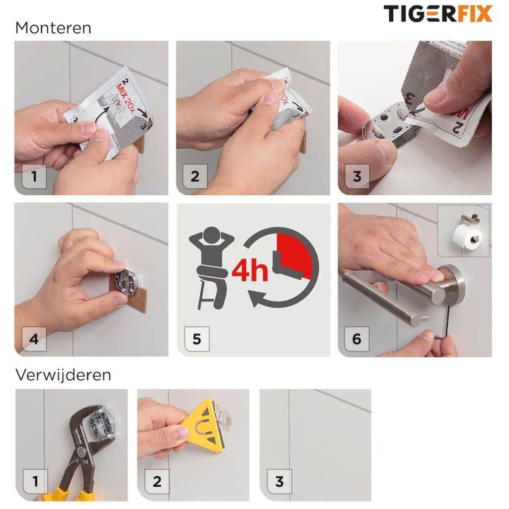 Het installeren van Tiger badkameraccessoires was nog nooit zo eenvoudig. Meng de lijm, plaats deze op de muurplaat en na slechts 4 uur kunt u de accessoire plaatsen. Het is zo simpel! Het grote voordeel van TigerFix is dat de muurplaat eenvoudig kan worden verwijderd zonder schade aan te richten of resten achter te laten. Door de muurplaat met een verstelbare sleutel te draaien, kunt u hem eenvoudig van de tegel verwijderen. Dit zal goed van pas komen in huurwoningen, bij verhuizingen en wanneer u accessoires wilt verplaatsen.