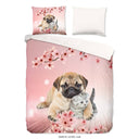 Dit Pure overtrek heeft een schattige print met kat en hond op een elegant roze achtergrond op de voorkant en een effenkleurige achterkant. Het overtrek heeft een handige rits.