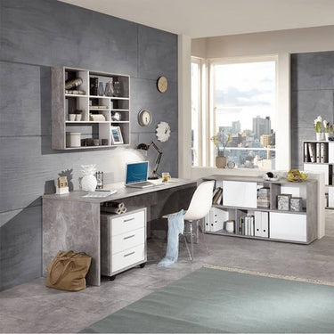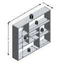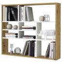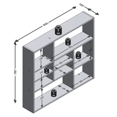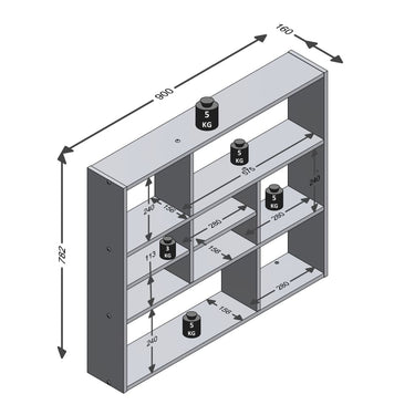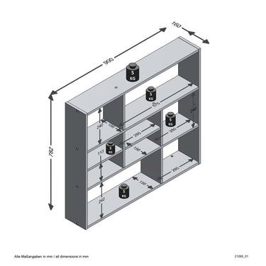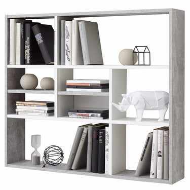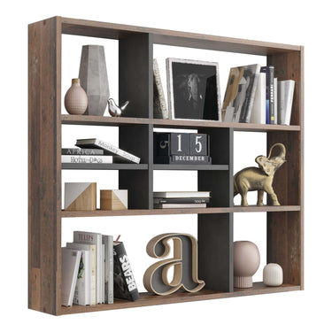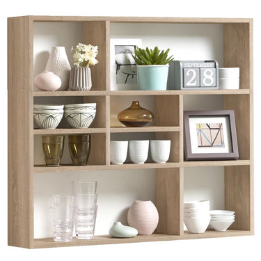 Het eigentijdse wandschap van FMD is een veelzijdig, zwevend schap bestaande uit 9 vakken van verschillende grootte die in een speels patroon in een rechthoekig frame gerangschikt zijn.