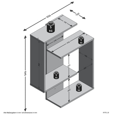 Het wandrek is gemaakt van met melamine bekleed spaanplaat en bestaat uit 2 vakken die aan één zijde open zijn. De 4 schappen zijn verbonden met een anders gekleurde, mooi contrasterende plaat. Dit wandmeubel past in elk interieur!