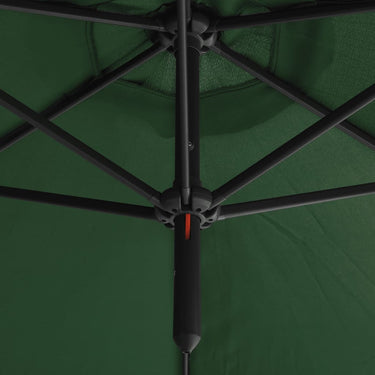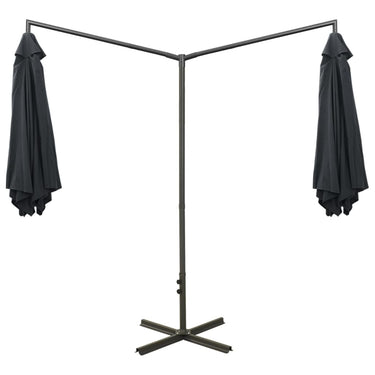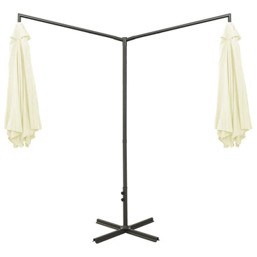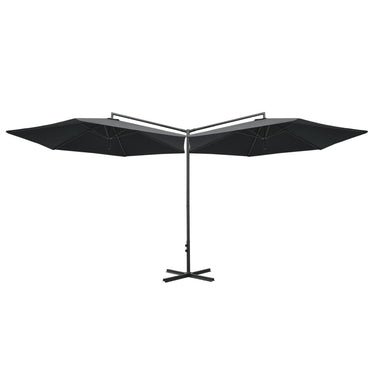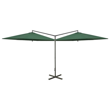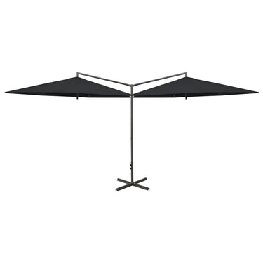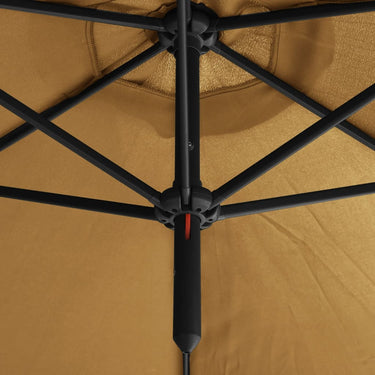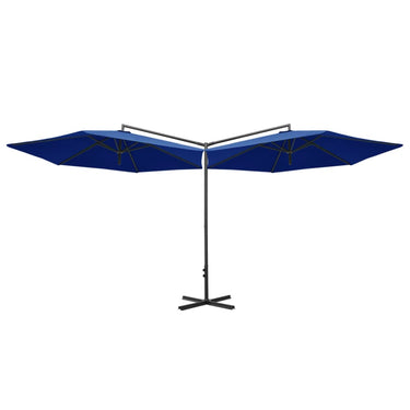 Deze parasol is gemaakt van polyester waardoor je optimaal beschermd bent tegen de zon. De stevige stalen paal en de stevige stalen baleinen houden de parasol stabiel. Hij heeft een stalen kruisvoet voor extra stabiliteit. Het ontwerp van 2 naast elkaar liggende doeken maakt hem geheel praktisch, elegant en uniek. Hij zorgt niet alleen voor meer schaduw, maar is ook een blikvanger in je tuin. De tuinparasol kan eenvoudig geopend en gesloten worden dankzij het zwengelmechanisme.