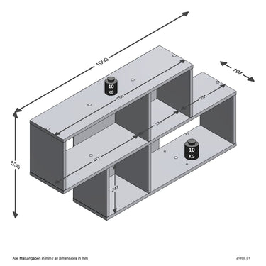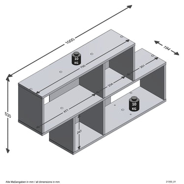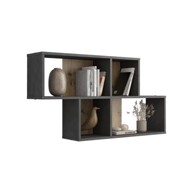 Het moderne wandschap van FMD is een veelzijdig, zwevend schap bestaande uit 4 vakken van verschillende grootte die in een speels patroon zijn gerangschikt.