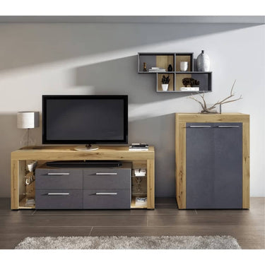 Het praktische schap is gemaakt van met melamine bedekt spaanplaat in een zandeikenkleur die bij vrijwel elke interieurstijl past.