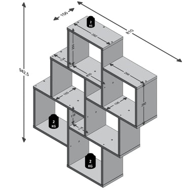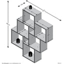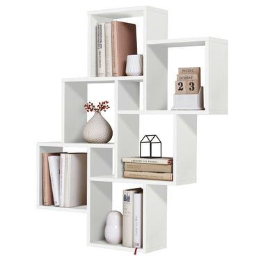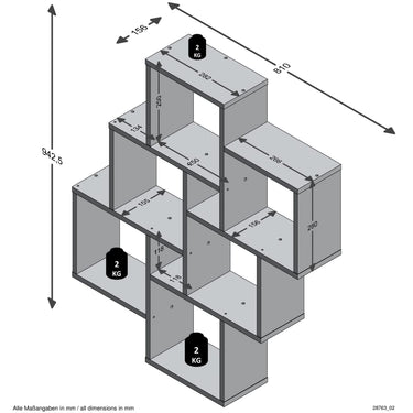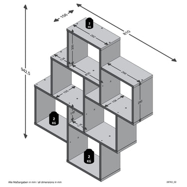 Het wandmeubel van FMD is een eigentijdse wandschap bestaande uit 6 grote en 2 kleinere vakken die in een speels patroon gerangschikt zijn.