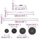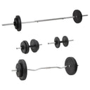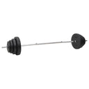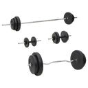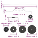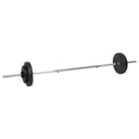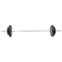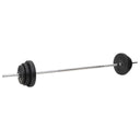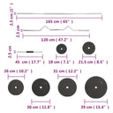 - Gewicht schijven: 4 x 2,5 kg, 6 x 1,25 kg, 2 x 10 kg, 2 x 5 kg, 2 x 15 kg
