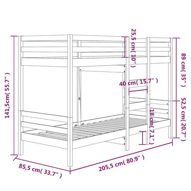 Ce lit superposé en bois est élégant et fonctionnel, ce qui en fait un supplément parfait à toute pièce dont l'espace est limité. Bois de pin massif : le bois de pin massif est un matériau naturel magnifique. Le bois de pin a un grain droit et les nœuds donnent au matériau son aspect caractéristique et rustique.Design sûr : le lit surélevé est conçu dans un souci de sécurité. Il comprend des garde-corps qui empêchent l'utilisateur de rouler pendant son sommeil.Convient aux espaces limités : le lit superposé en bois massif est un excellent choix pour toute pièce dont l'espace est limité. Il fournit deux lits individuels avec un design compact. Remarque :La livraison comprend uniquement les cadres de lit. Les matelas ne sont pas inclus. Vous pouvez consulter notre boutique pour trouver les matelas assortis.L'épaisseur du matelas ne doit pas dépasser 11 cm. Et nous ne recommandons pas de matelas moelleux pour des raisons de sécurité.Le lit supérieur ne convient pas aux enfants de moins de 6 ans.Chaque produit est livré avec un manuel de montage dans la boîte pour un montage facile.