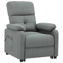Asseyez-vous et détendez-vous dans ce fauteuil de massage électrique très confortable ! Fonction d'inclinaison électrique : le fauteuil inclinable est équipé d'un moteur électrique pour la fonction d'inclinaison. Il offre 3 positions d'inclinaison et vous pouvez facilement régler le dossier et le repose-pied à l'aide de la commande manuelle à 2 boutons incluse, en fonction de votre confort.Fonction de vibration : les 6 points de massage vous permettent de faire l'expérience d'un massage mieux ciblé. De plus, la télécommande incluse vous permet de choisir différents programmes de massage. La fonction de massage est alimentée par le connecteur USB, mais la source d'alimentation USB 5V certifiée n'est pas incluse.Expérience d'assise confortable : le siège, le dossier et les larges accoudoirs rembourrés épais recouverts de tissu procurent une sensation confortable et chaleureuse, vous permettant de vous sentir enveloppé lorsque vous êtes assis. Le tissu présente un aspect simple et épuré, et est respirant et durable.Cadre solide et stable : le cadre en bois et en métal offre une structure solide et une grande stabilité. Ce fauteuil inclinable est confortable et durable.
