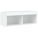 Ces unités murales TV sont la solution parfaite pour votre espace de vie afin de maximiser l'espace et de garder les surfaces au sol sans encombrement. Matériau robuste : le bois d'ingénierie est d'une qualité exceptionnelle avec une surface lisse et présente également résistance, stabilité et résistance à l'humidité.Lumières LED RVB : la unité TV est équipée de lumières LED RVB vibrantes. Avec divers menus personnalisables, vous pouvez changer sans effort la couleur des lumières et même les régler automatiquement. Ces lumières LED renforcent non seulement l'aspect contemporain du meuble TV flottant, mais aussi son attrait pour la mode.Design mural : le meuble de télévision peut être fixé au mur pour ajouter un espace de stockage supplémentaire. De cette façon, vous pouvez maximiser votre espace au sol et garder la zone propre.Grand espace de rangement : le meuble TV flottant est doté de différentes options de rangement, offrant ainsi un grand espace pour ranger vos objets quotidiens tels que les livres, les DVD, les accessoires multimédias et d'autres articles bien organisés et à portée de main.Design polyvalent : vous pouvez l'utiliser comme meuble TV ou le monter sur le mur du lieu de travail pour un rangement pratique des outils ou d'autres articles divers. De plus, il transforme un mur vide en un élément de décoration. Bon à savoir :Les vis et les chevilles pour l'intérieur du mur ne sont pas incluses. Nous vous conseillons de trouver et d'utiliser des vis et des chevilles adaptées spécifiquement à vos murs. Si vous n'êtes pas sûr, vous pouvez consulter un professionnel. Veuillez lire et suivre chaque étape des instructions.Ce produit est doté d'un connecteur USB qui nécessite une source d'alimentation USB de 5V certifiée (non incluse).