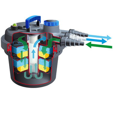 Le fitre de bassin BioPressure 10000 PlusSet 1355417 d'Ubbink est un système de filtration avec une unité UVC intégrée fonctionnant sous pression. Le système de filtre biologique-mécanique et l'appareil UVC intégré en combinaison avec la pompe de bassin Ubbink recommandée garantie, en peu de temps, une eau claire dans le bassin. La technologie de filtration résiste à une pression de 0,49 bar.Le système de fermeture spécial assure l'intégrité du filtre, même dans ces conditions difficiles. Le système de tapis filtrant empêche le blocage du système de filtration et nettoie mécaniquement l'eau en bloquant les impuretés. Le filtre peut rapidement être nettoyé pendant le fonctionnement grâce au robinet de vidange.