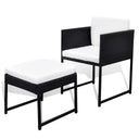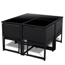 Grâce aux cadres en acier thermolaqué, la table et les chaises sont robustes et grâce à leur construction légère, toutes les pièces sont faciles à déplacer. Grâce au rotin PE résistant aux intempéries et imperméable, la salle à manger est facile à entretenir. Le plateau de table en verre trempé est facile à essuyer avec un chiffon humide. Les coussins d'assise épais et moelleux avec rembourrage en fibre de coton sont très confortables. Les housses amovibles et lavables sont dotées de fermetures éclair. Lorsque les chaises et les tabourets ne sont pas utilisés, ils peuvent être soigneusement placés sous la table pour gagner de la place.