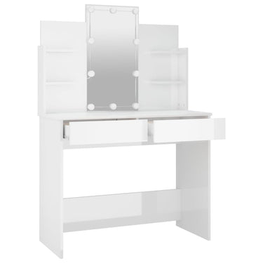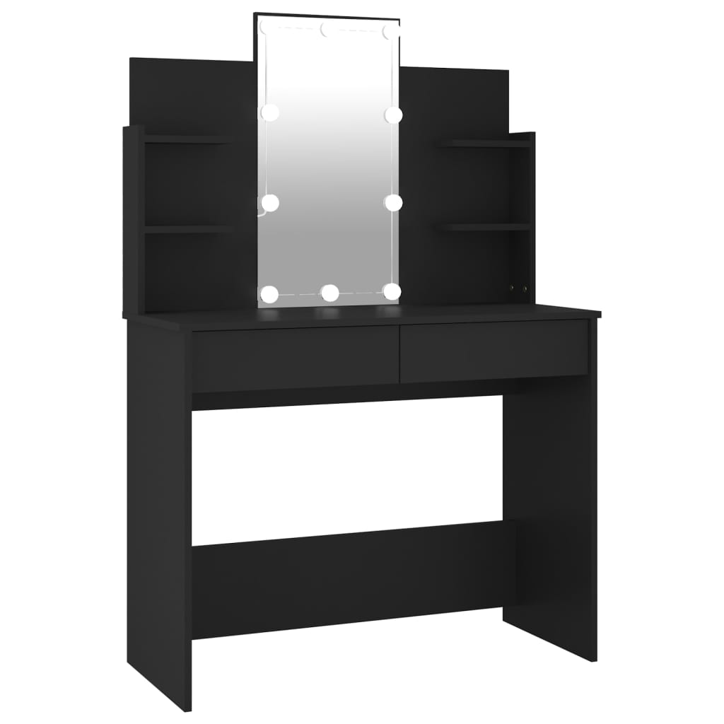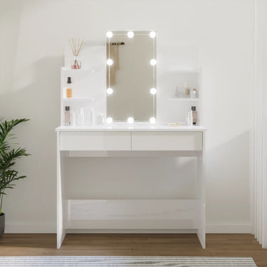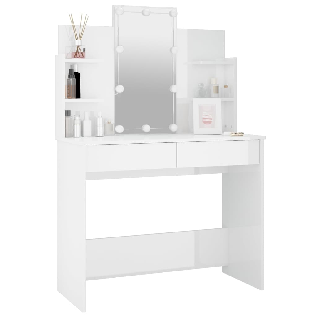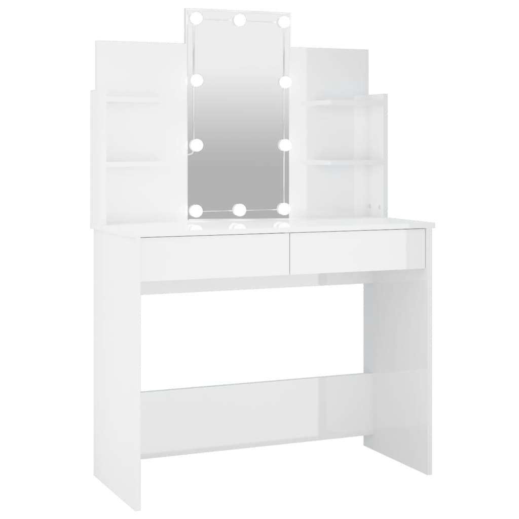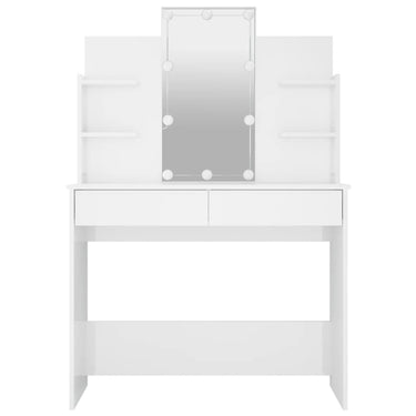 Dotée de lignes droites raffinées et d'une forme asymétrique soulignant un style unique, cette coiffeuse ne manquera pas de faire tourner les têtes ! Matériau durable : le bois d'ingénierie est d'une qualité exceptionnelle avec une surface lisse et présente également résistance, stabilité et résistance à l'humidité.Lumière LED : la table cosmétique dispose d'ampoules LED avec USB, qui sont faciles à changer de mode du blanc chaud au blanc froid. Les ampoules LED autour du miroir illuminent également votre beauté.Espace de rangement pratique : cette table de maquillage dispose également d'étagères ouvertes et de deux tiroirs, ce qui vous permet de ranger vos accessoires de maquillage et de garder tout à sa place. Attention :Afin d'éviter qu'il ne bascule, ce produit doit être utilisé avec le dispositif de fixation murale fourni.